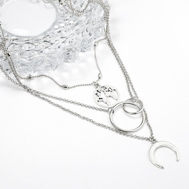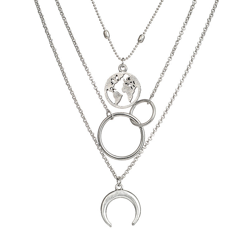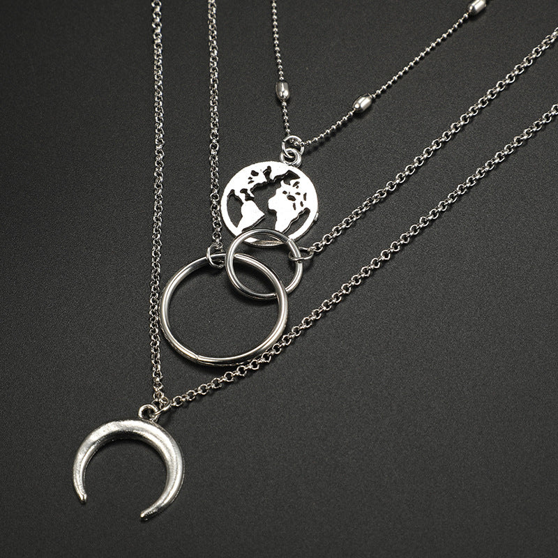 Fashion Geometric Size Circle Water Drop Horn Horn Moon Hollow Out World Map Long Three-layer Necklace Clavicle Chain